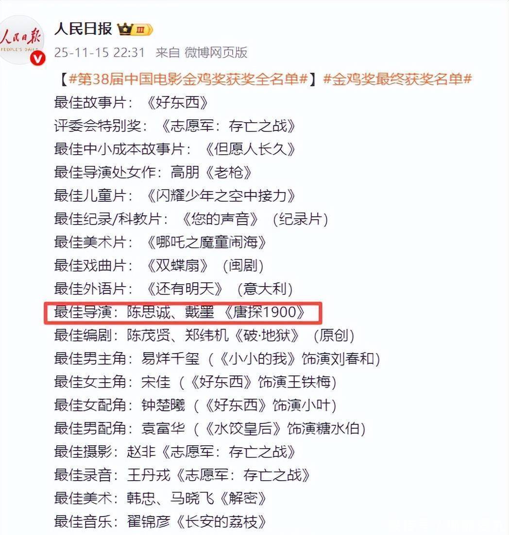 今年《唐探1900》再创辉煌,助他登顶中国电影票房最高导演!更让人沸腾的是,人民日报刚刚官宣:47岁的陈思诚凭此片荣获金鸡奖最佳导演!