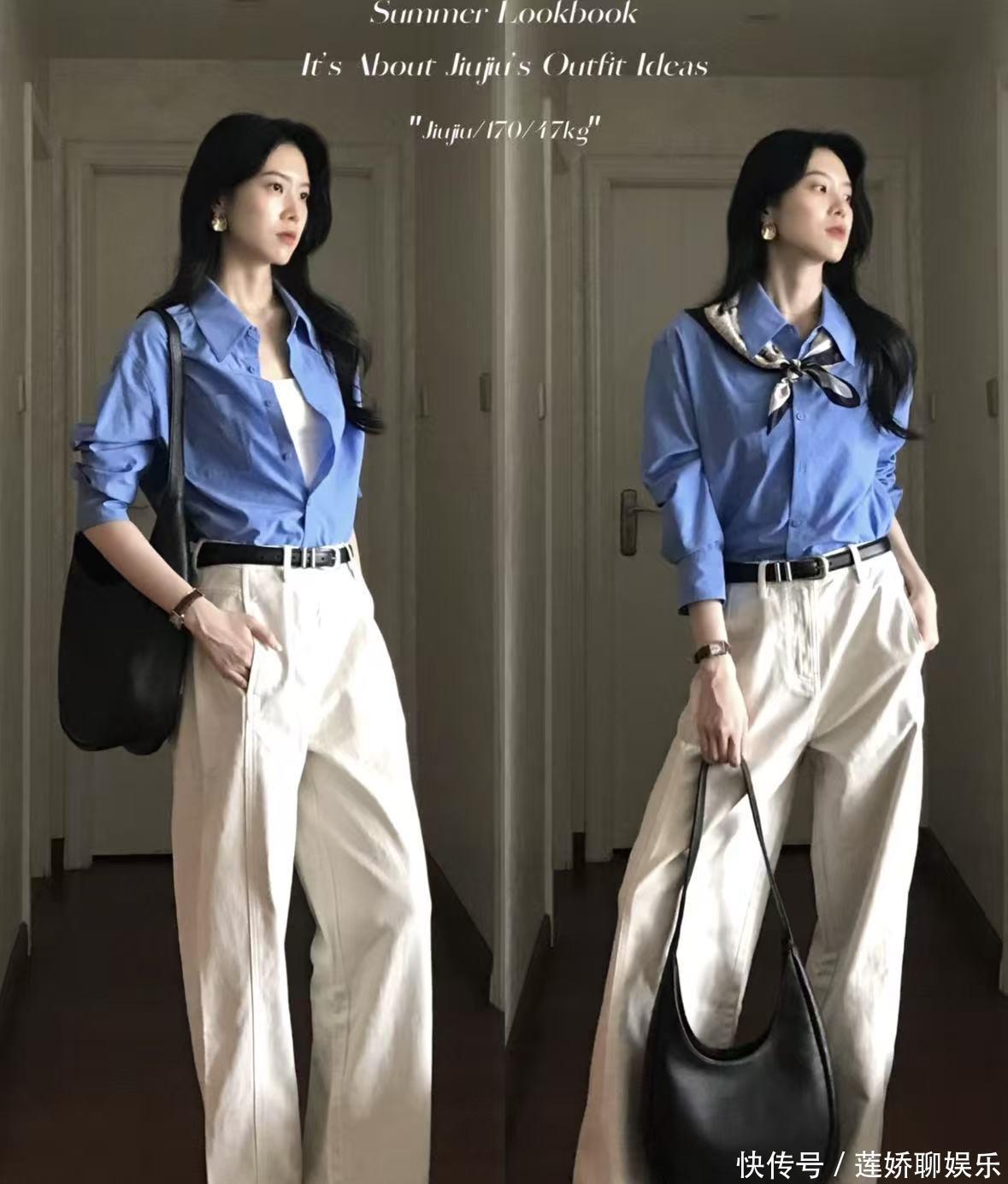 公式二:通勤干练风 = 挺括衬衫 + 高腰直筒裤/微喇裤怎么抄:放弃死板的合身白衬衫,选择略带宽松感、材质挺括的款式。下身搭配一条高腰的直筒西装裤或复古微喇牛仔裤。关键是把衬衫全扎进去,或者只扎前面,配上一条细细的皮带。鞋子可以是带点跟的短靴或简约高跟鞋。